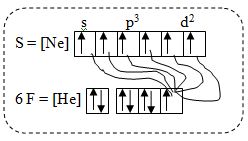 Atom S akan berikatan tunggal dengan F(nomor atom 9), karena jumlah elektron valensi F adalah 7 sehingga hanya membutuhkan satu buah elektron lagi agar stabil secara oktet.