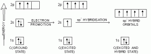 Secara keseluruhan, proses hibridisasi terlihat dalam diagram skematik berikut yang mewakili proses hibridisasi atau tingkat hibridisasi yang disertai dengan tingkat energi untuk setiap tahap dan setiap orbital.