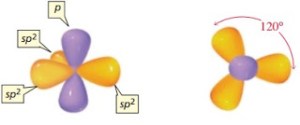 Hibridisasi sp2 merupakan penggabungan 1 orbital s dengan 2 orbital p sehingga terdapat 1 orbital p bebas yang tidak digunakan untuk hibridisasi. Hibridisasi sp2 menghasilkan jenis ikatan rangkap 2 sehingga kekutan ikatannya lebih tinggi daripada ikatan tunggal dan panjang ikatan yang dihasilkan juga lebih pendek. Hibridisasi sp2 berguna untuk menjelaskan bentuk struktur molekul trigonal planar. Orbital 2s dan dua orbital 2p melakukan hibridisasi membentuk tiga orbital sp, masing-masing terdiri dari 67% karakter p dan 33% karakter s. Cuping depan mensejajarkan diri membentuk trigonal (segitiga) planar, menghadap sudut segitiga untuk meminimalisasi penolakan elektron.